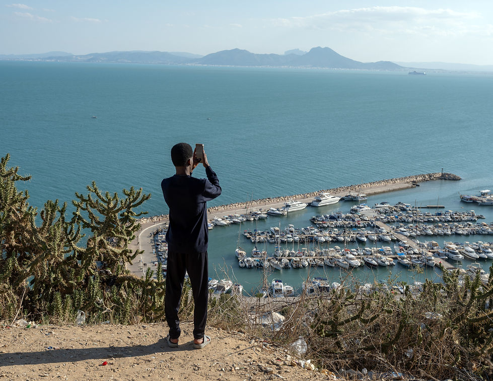 Een migrant maakt op een uitkijkpunt in het populaire plaatsje Sidi Bou Said vlakbij Tunis een foto van de zee en de jachthaven.